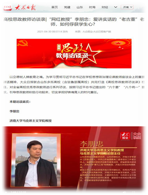 优秀教学奖等奖励奖项。李朋忠教授是省委组织部名师送教专家库成员,团省委宣讲团成员,省边防总站宣讲团成员,是山东省团校、历城二中、济南外国语学校、山东人才集团泰山研修院等多家单位特聘教授。