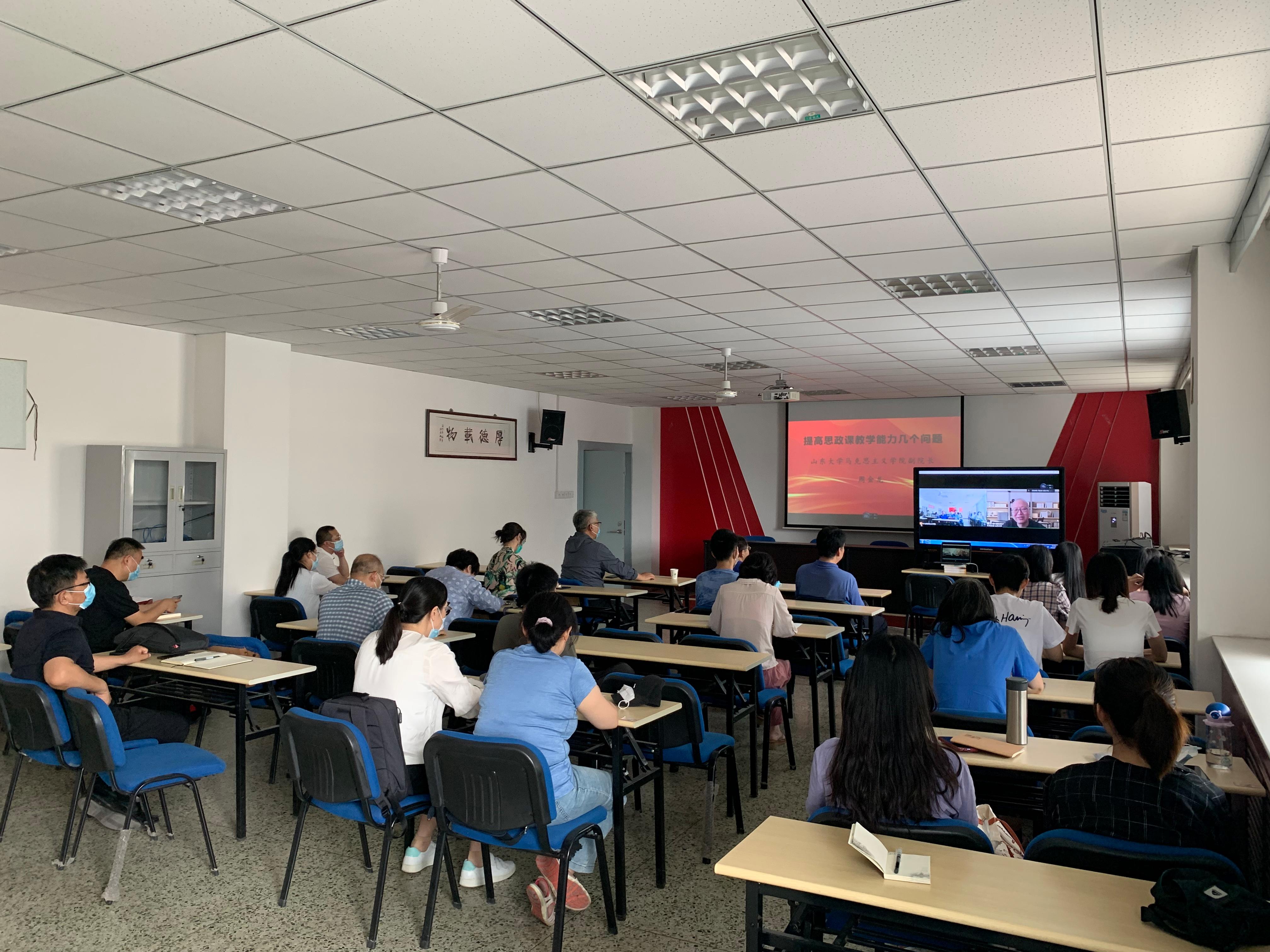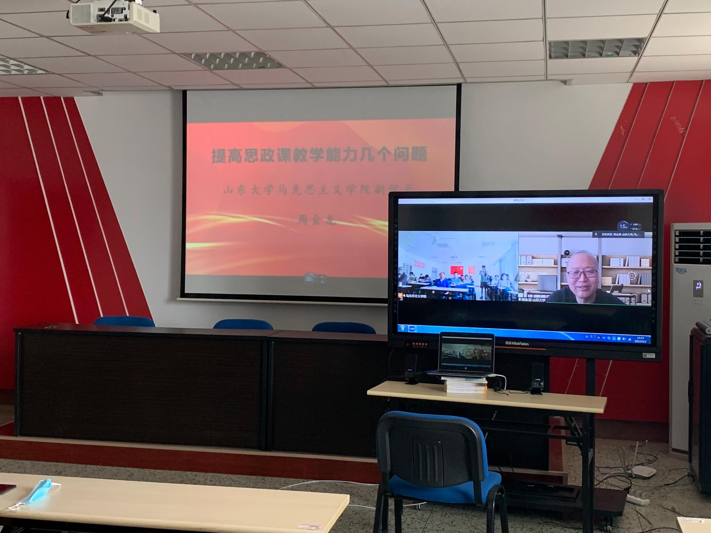 62日下午,H动画 邀请山东省高校思政课教师培训基地办公室主任、山东大学H动画 副院长周金龙教授进行关于“提高思政课教学能力几个问题”的线上辅导报告。H动画 文洪朝院长主持会议,H动画 张兵亭书记、杨立志副院长,以及思政骨干教师参加此次辅导报告。