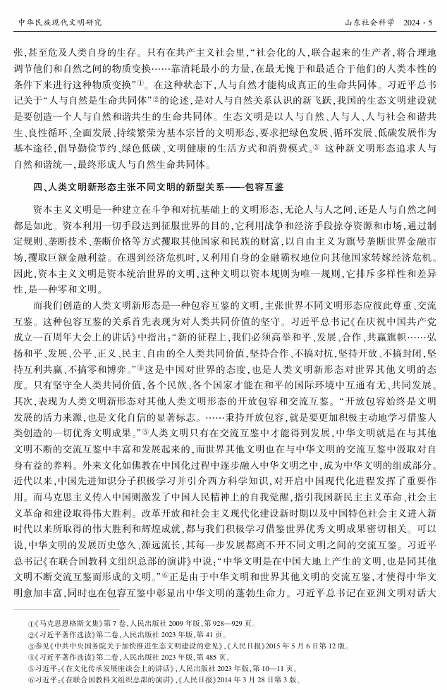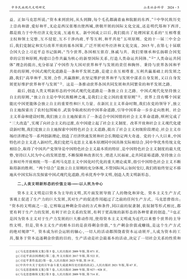 李霞教授的学术论文《人类文明新形态的四重维度》在《山东社会科学》(2024年第5期)发表,并被《中国社会科学文摘》(2024年第9期)观点摘登。 论文指出:人类文明新形态是中华民族在党的领导下创造的一种新的文明形态,其发展道路、价值立场、整体内涵、文明关系都不同于资本主义文明。其道路根基是中国式现代化道路,是社会主义现代化之路、和平发展之路、独立自主之路;其价值立场是以人民为中心,人民是文明的创造主体,也是文明成果的享受者;其丰富内涵表现在它是包括物质文明、政治文明、精神文明、社会文明、生态文明协调发展的整体性文明;它在不同文明之间建立了一种新型的文明关系,是一种胸怀世界、与世界其他文明包容互鉴的文明。人类文明新形态展现了科学社会主义的巨大生机,突破了将人类文明等同于资本主义文明的传统观点,体现了世界文明发展的多样性特征,开辟了人类文明发展的新路向。